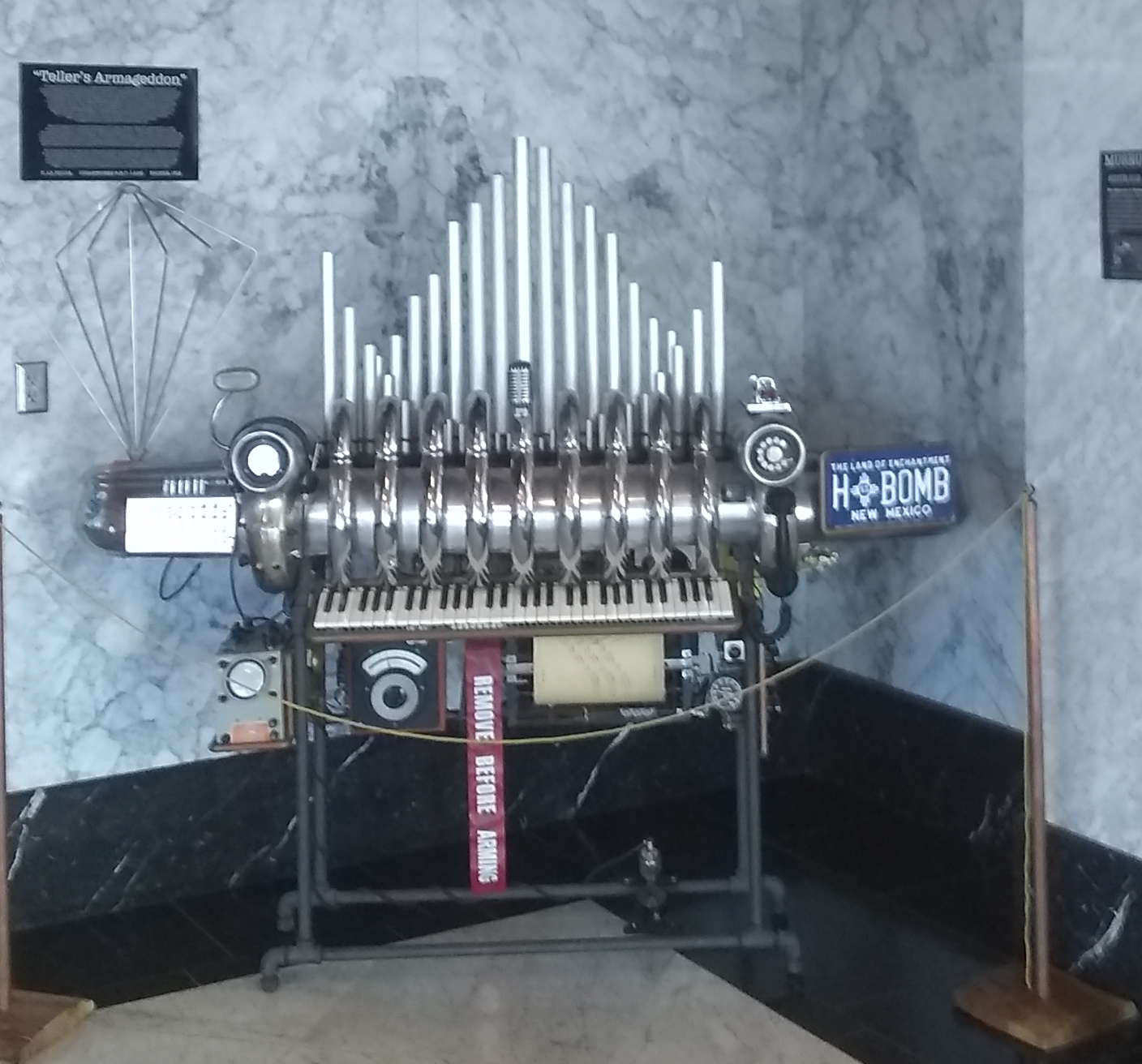 Steve La Riccia, drawing upon an extraordinary affinity for the technological materials of the 19th and 20th centuries, has been amazing the public for forty years. He produced, beginning in the early 1980s, a significant body of work with his SX-70 manipulations -- wherein a stylus is rubbed over the still-developing print which has just been ejected from the hi-tech Polaroid camera -- and has achieved with it many beautiful and evocative results, as with his 1996 Nude with Hats; but when that technology was discontinued circa 2010, he made the leap to hyperspace with his interactive assemblages of steam-age and space-age components, and one of which, Teller's Armageddon, has been the subject of our inaugural exhibit in the Miner Building lobby. |