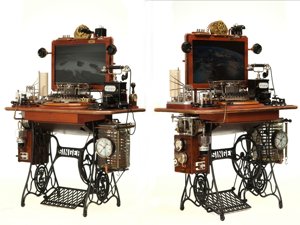 Steve La Riccia, drawing upon an extraordinary affinity for the technological materials of the 19th and 20th centuries, has been amazing the public for forty years. He produced, beginning in the early 1980s, a significant body of work with his SX-70 manipulations -- wherein a stylus is rubbed over the still-developing print which has just been ejected from the hi-tech Polaroid camera -- and has achieved with it many beautiful and evocative results, as with his 1996 Nude with Hats; but when that technology was discontinued circa 2010, he made the leap to hyperspace with his interactive assemblages of steam-age and space-age components, and one of which, Teller's Armageddon, has been the subject of our inaugural exhibit in the Miner Building lobby. |